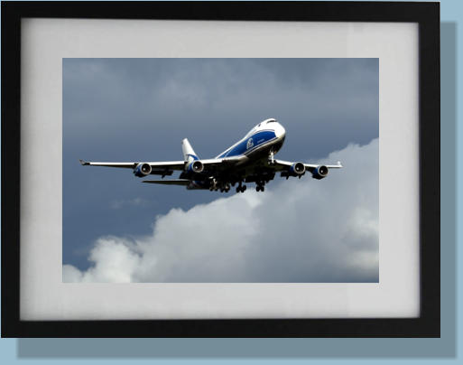 A3, A4 and 5x7in prints are mounted in quality wooden frames similar to the example (left), which features a Cargologic 747 freighter on its final approach to East Midlands Airport.